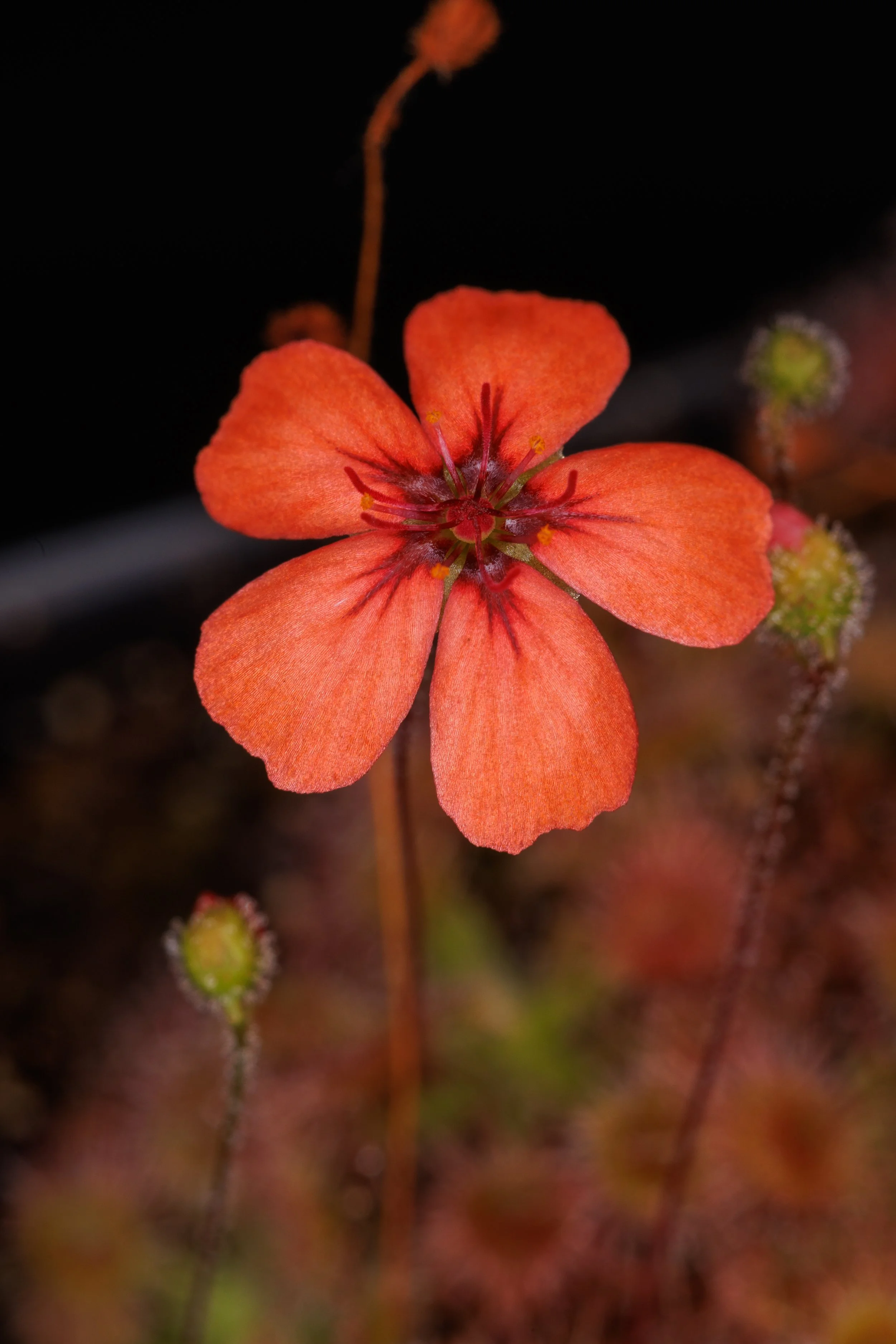 Drosera pulchella “orange with red veins” is a robust form of Drosera pulchella that flowers profusely with large orange flowers with red veins radiating from the center. The rosettes can reach around 1” in diameter with the characteristic circular lamina and long tentacles.